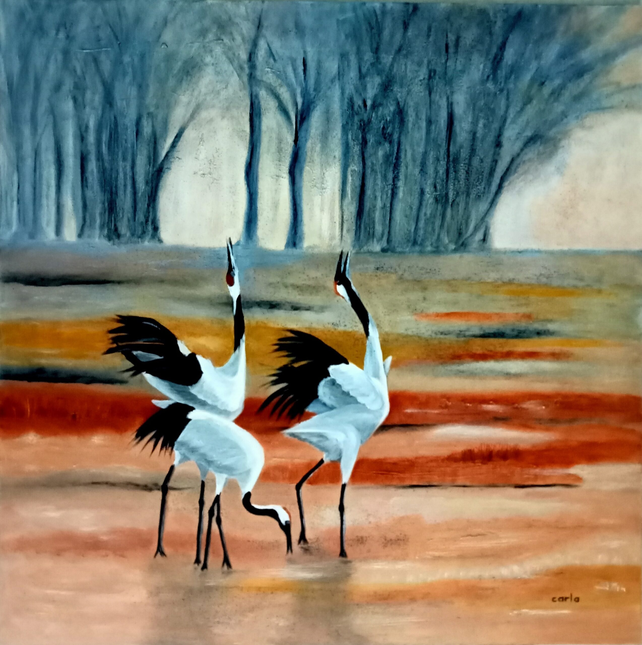 Kraanvogels, olie, 60 x 60