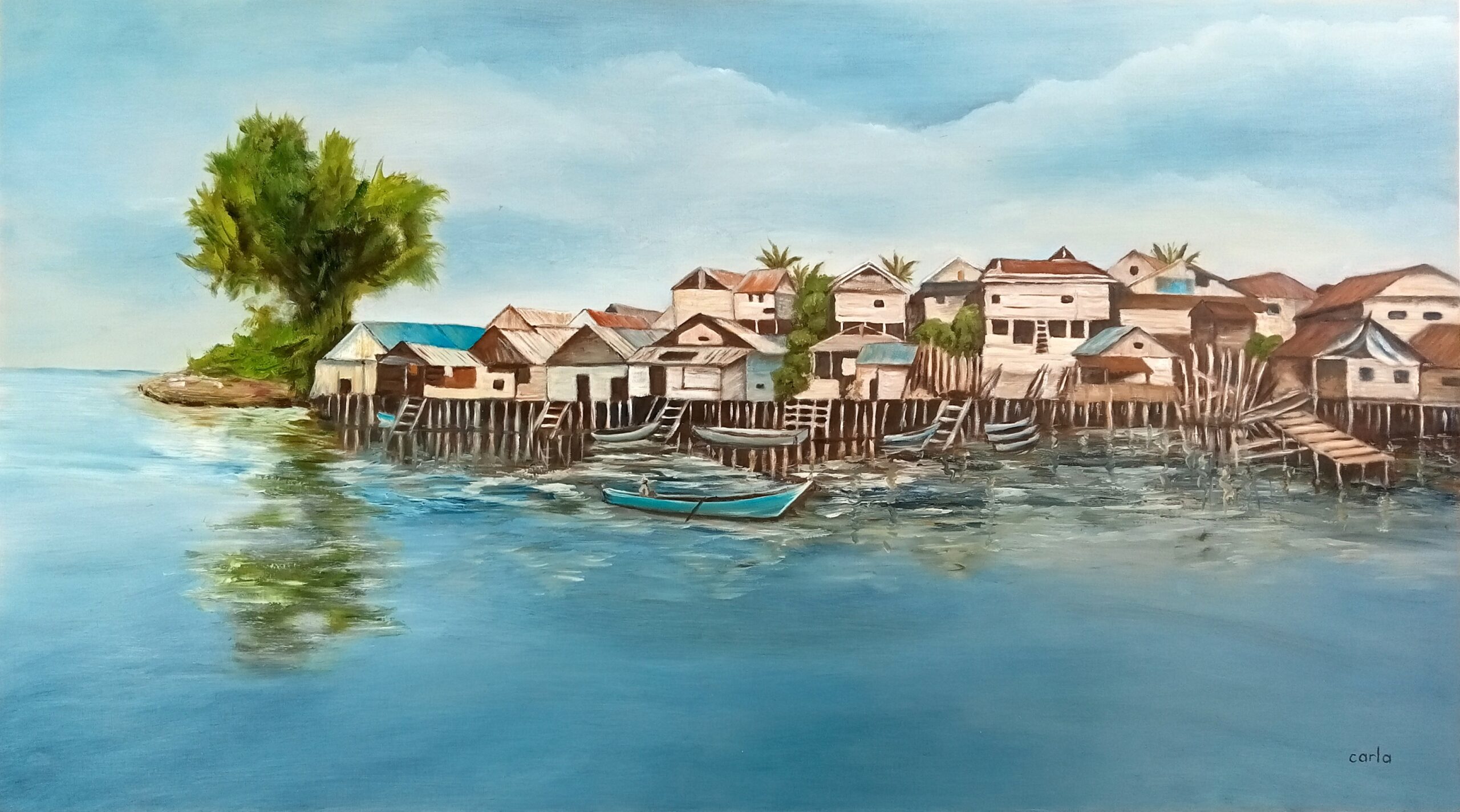 Huizen op palen, oil, 45 x 80