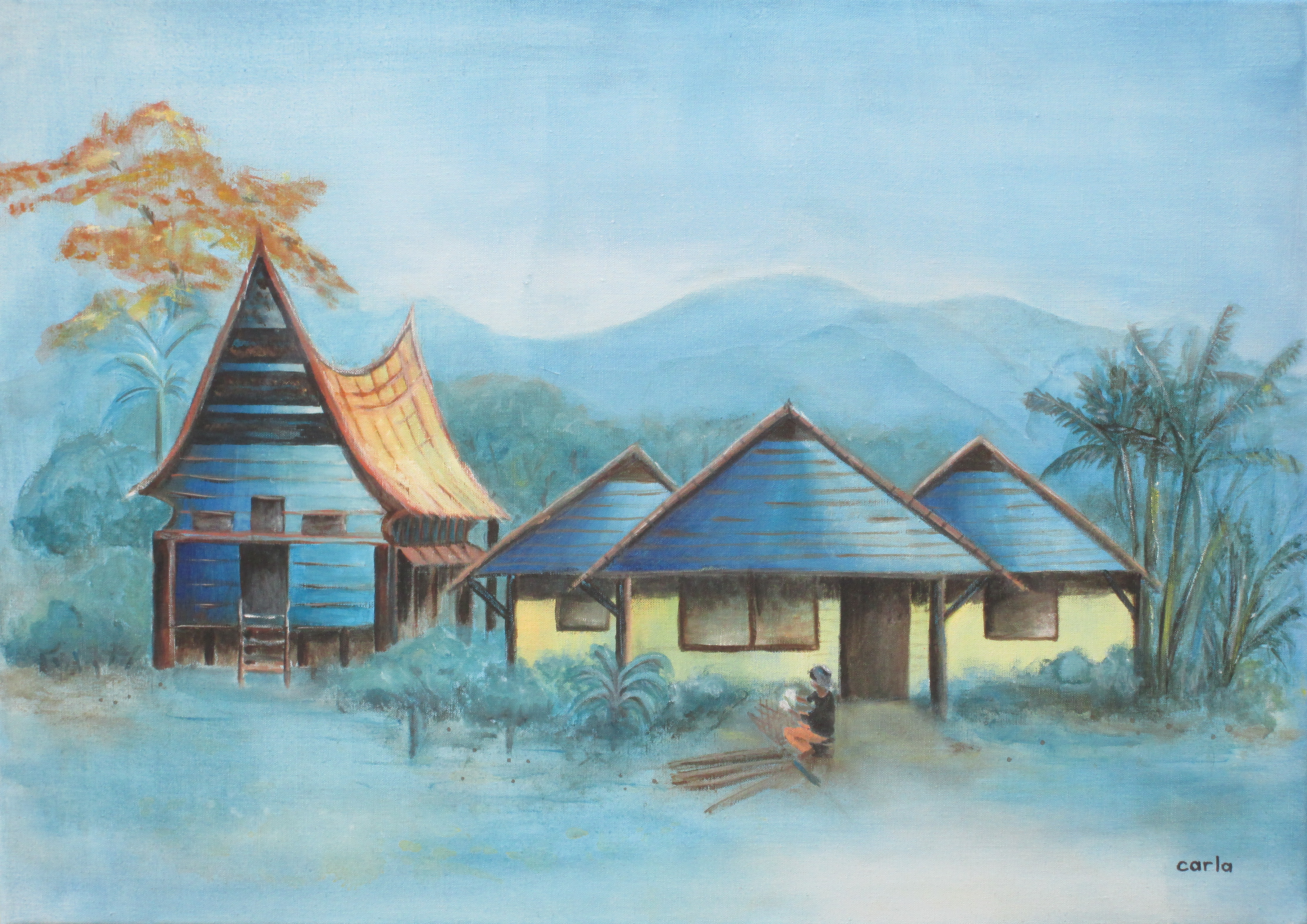 Minangkabau huizen, acryl, 50 x 70